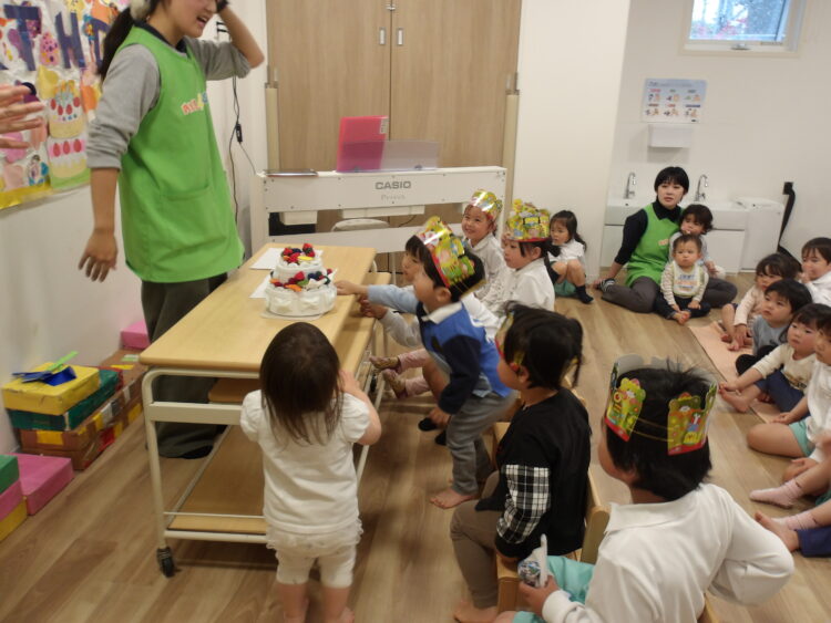 今月のお誕生日会の子は、皆で白いケーキ🎂にブルーベリー🫐などの果物を並べて楽しんでいましたよ![]()