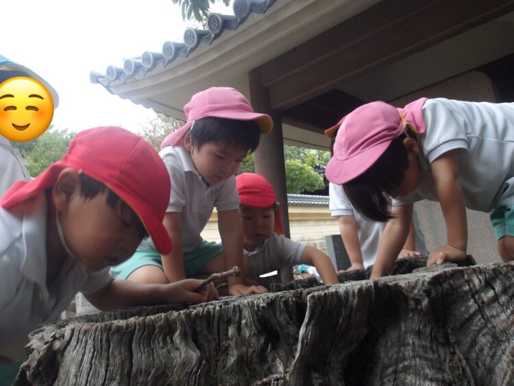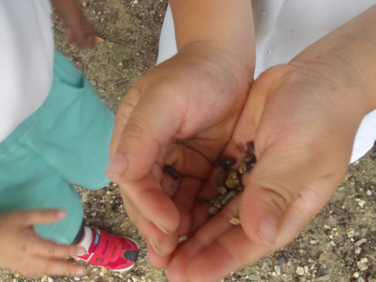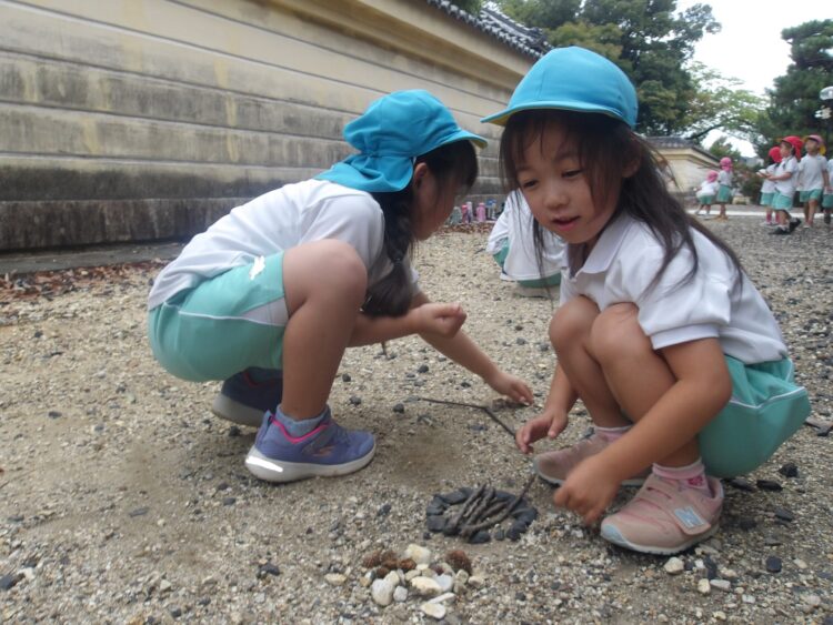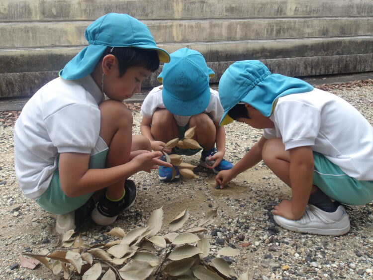 ダンゴムシやどんぐり、木の葉などの自然物に興味津々なみんな👀