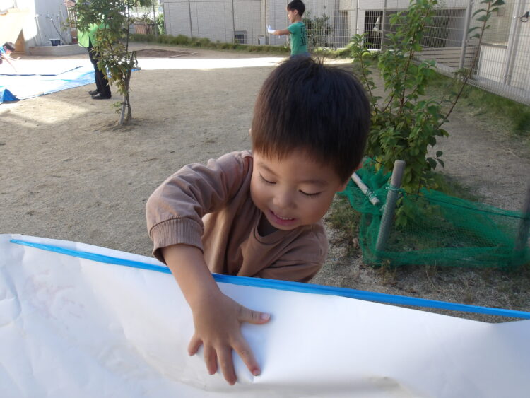 天気もよく、園庭でのびのびと筆やローラーを握り、全身を使って自由に描きました!☀️