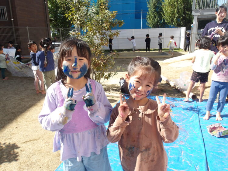 色の混ざりや感触を楽しみながら、絵の具を手や顔に塗るボディペインティングもしました