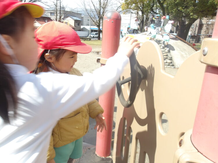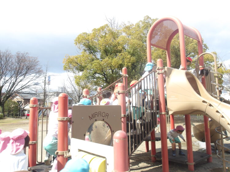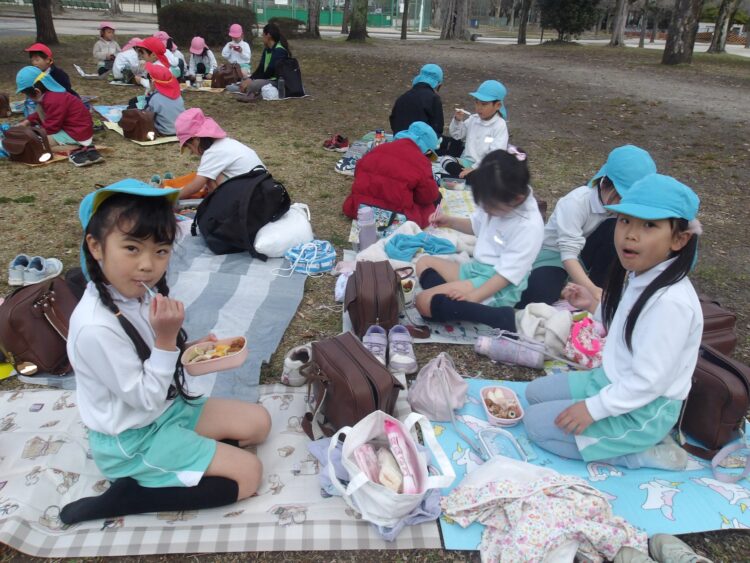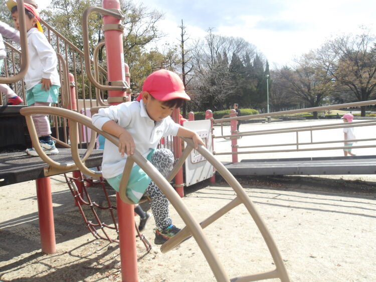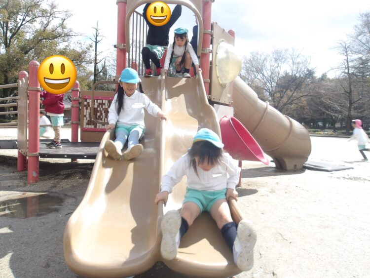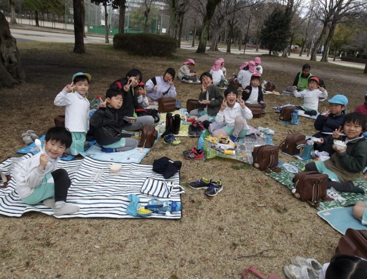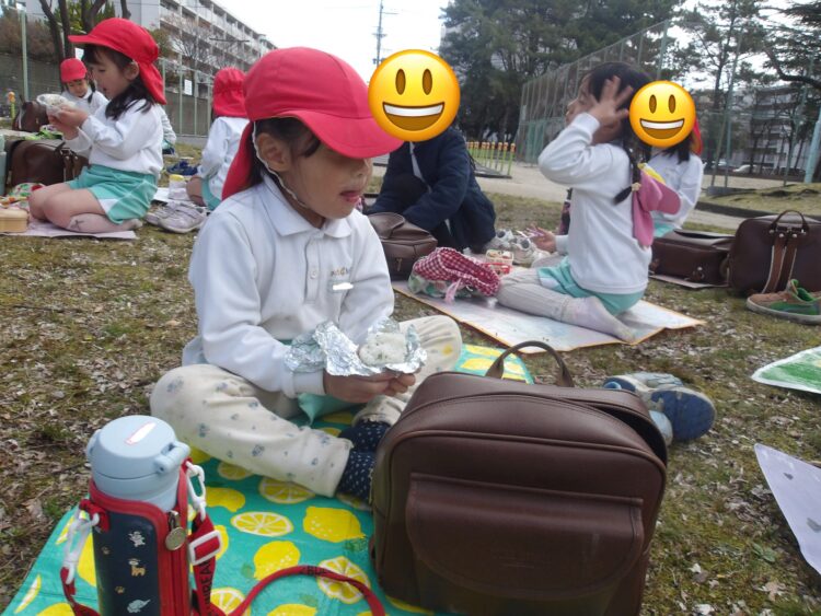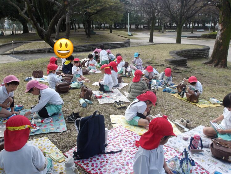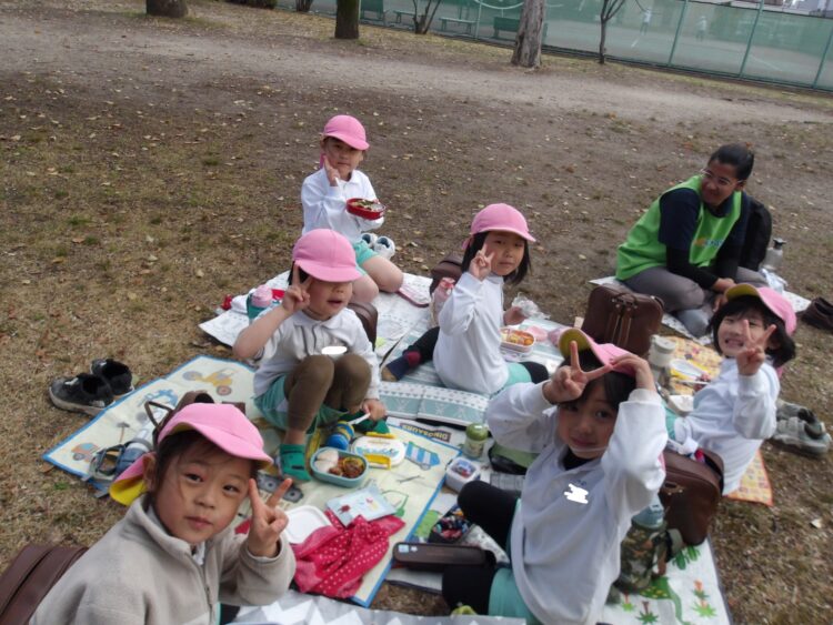 道中もついてからも遊具で遊んでいる時も「もうすぐおべんとう?」
