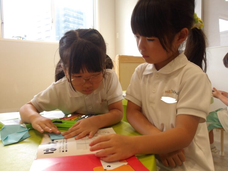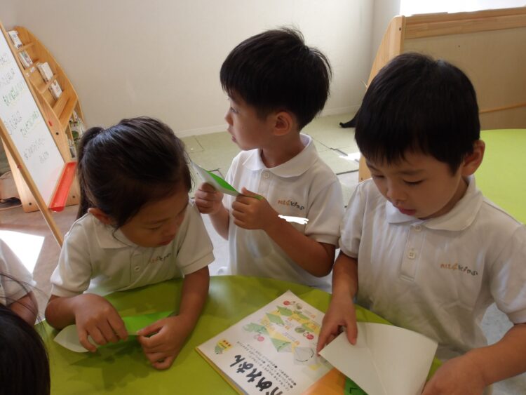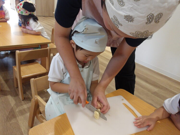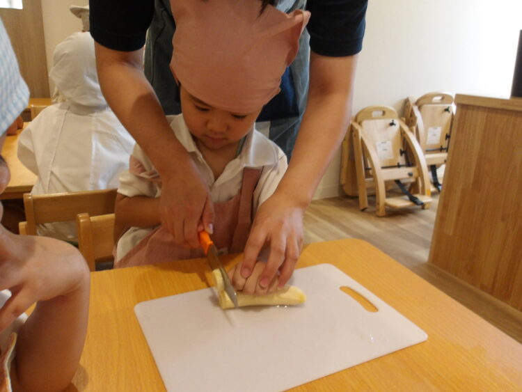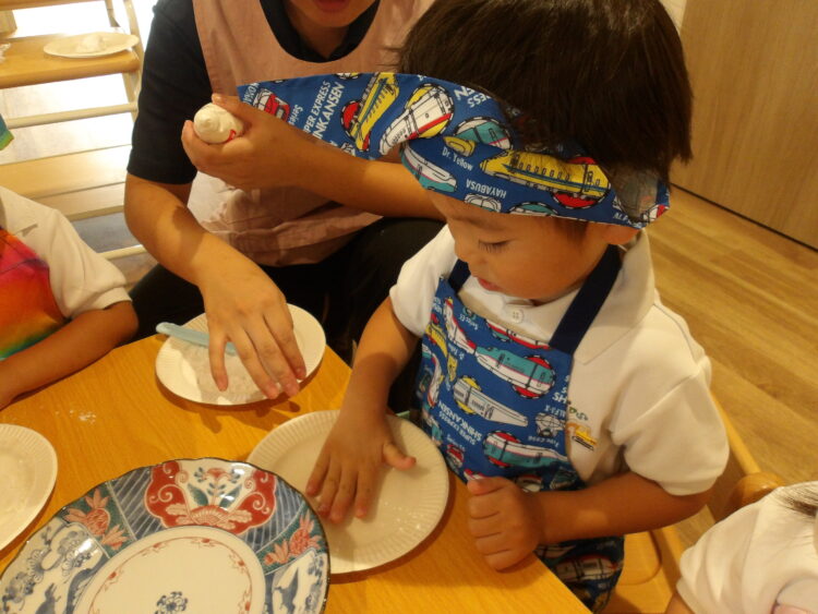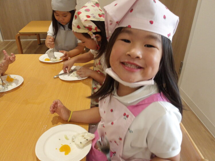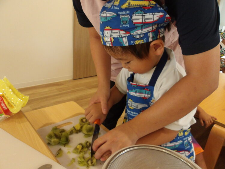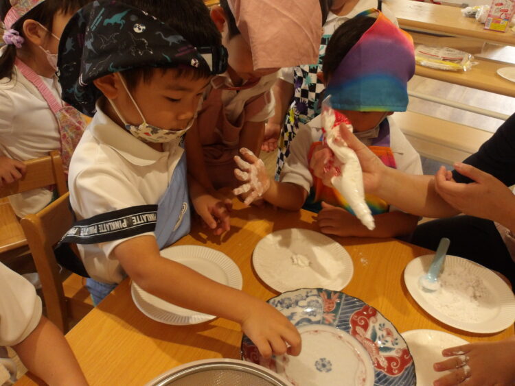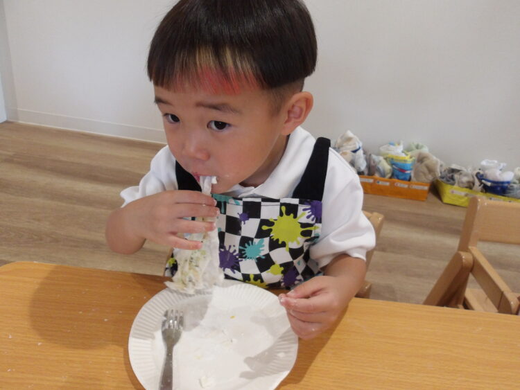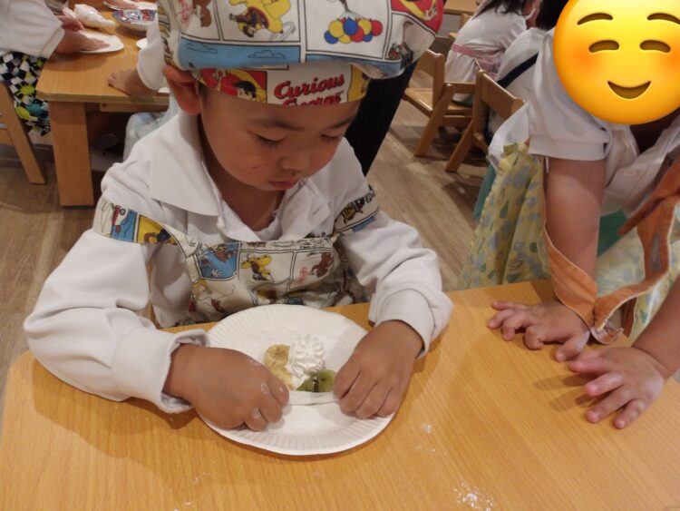 先生と一緒にキウイ🥝とバナナ🍌を切りました! 次にライスペーパーを水につけ、片栗粉をまぶしました! 最後に、生クリームと果物をのせて包んだら完成です! 自分でつくった大福が美味しかったようで、おかわりを求めるお友だちがほとんどでした🤭