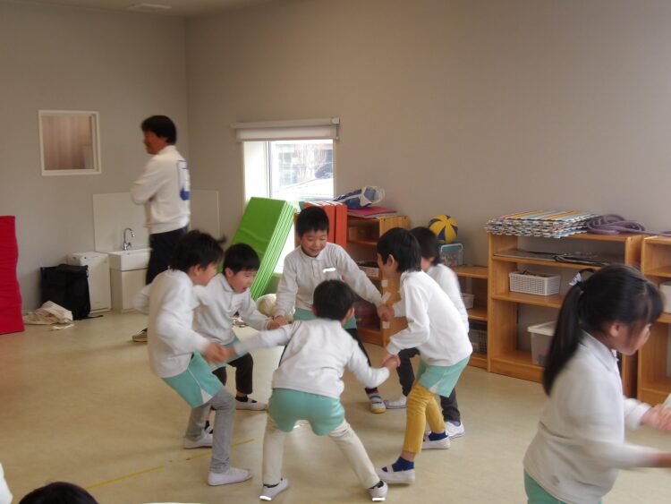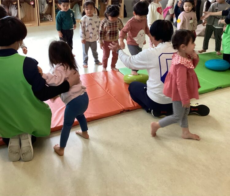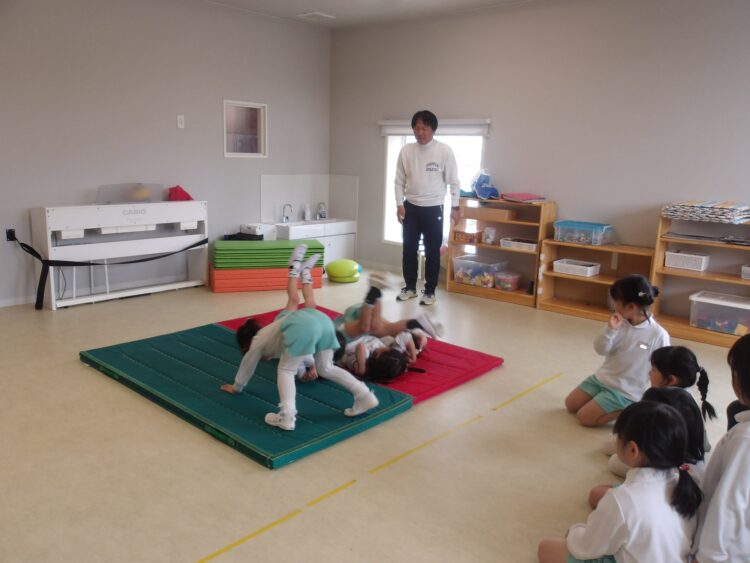 お友だちと手を繋いでぐるんと前転!