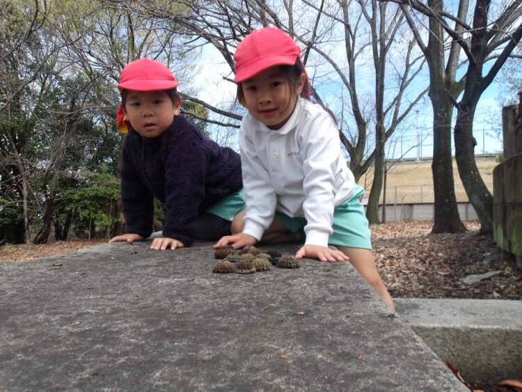 みんな大好きな鬼ごっこをする子もいれば、枯れ葉🍂や木の実がたくさん落ちていたので、それらを集めてごっこ遊びをしたりお店屋さんごっこをしたりする子がいました![]()