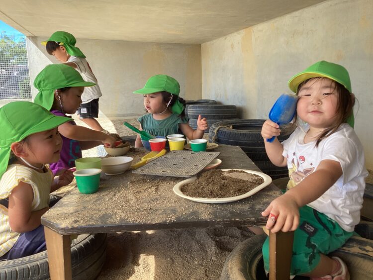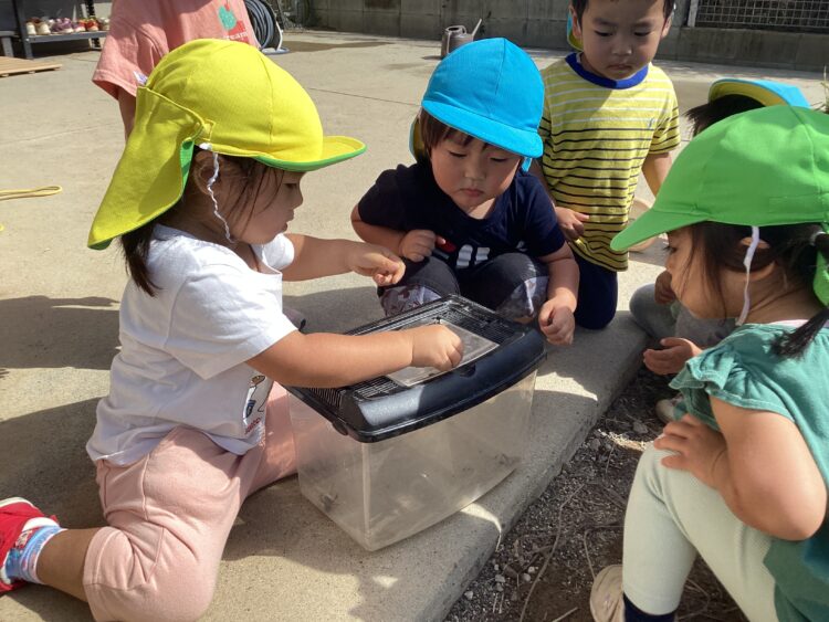 お兄さんが何か捕まえたみたいです!お友だちは興味津々