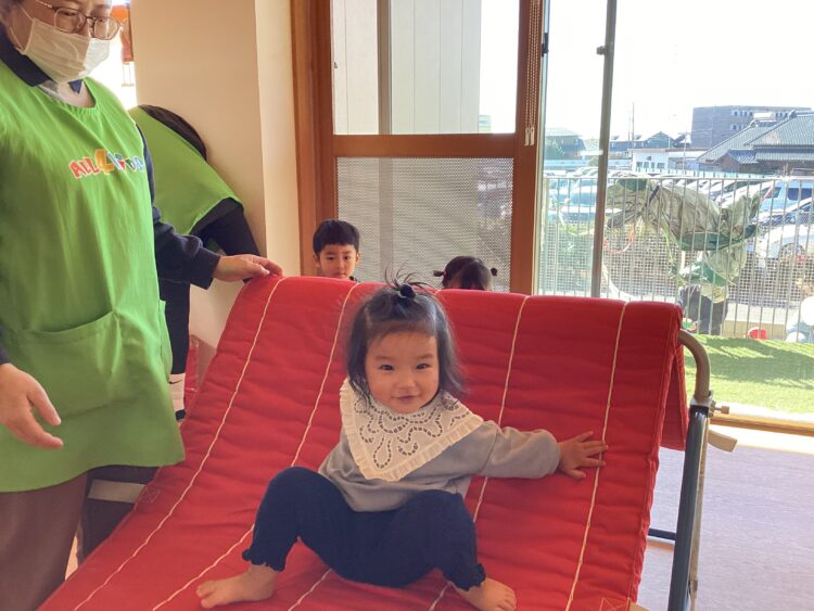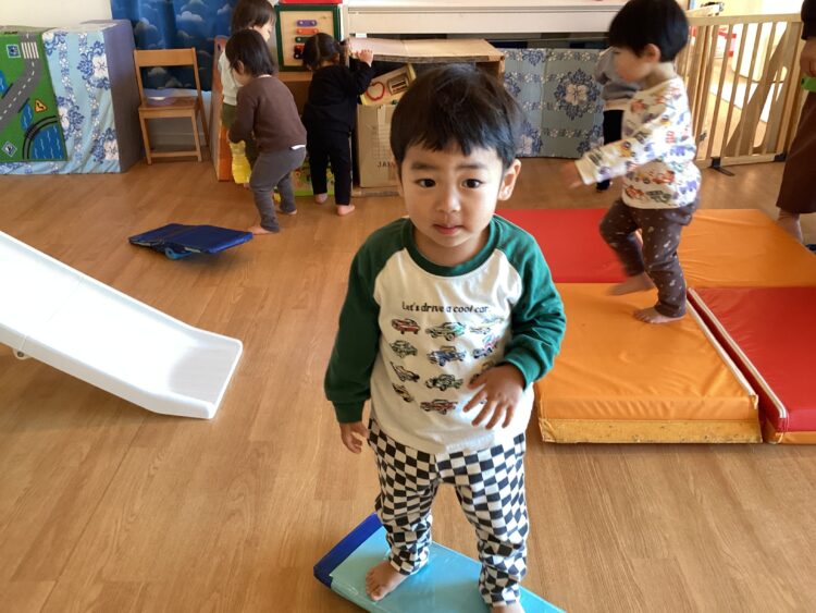 保育者の手作りのバランスボードも器用に乗りこなしていますね
