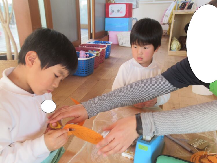 ハサミで切ったり、好きな色で模様を描いてオリジナルのへび凧を作っていました!