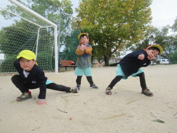 どんぐりを拾った際は煮沸や冷凍をすると良いようです今岡公園にも落ち葉や木の実がたくさん落ちていました皆のお顔より大きい葉っぱもありますよ子どもたちは寒さや風邪にも負けずに元気です