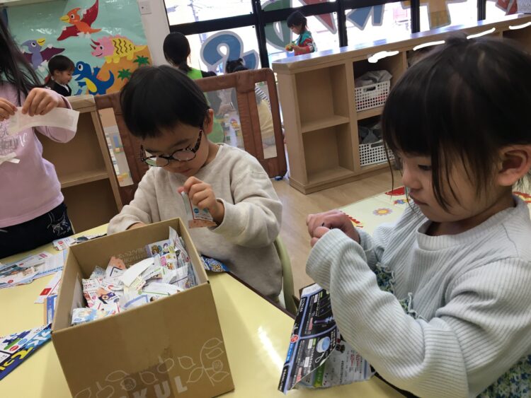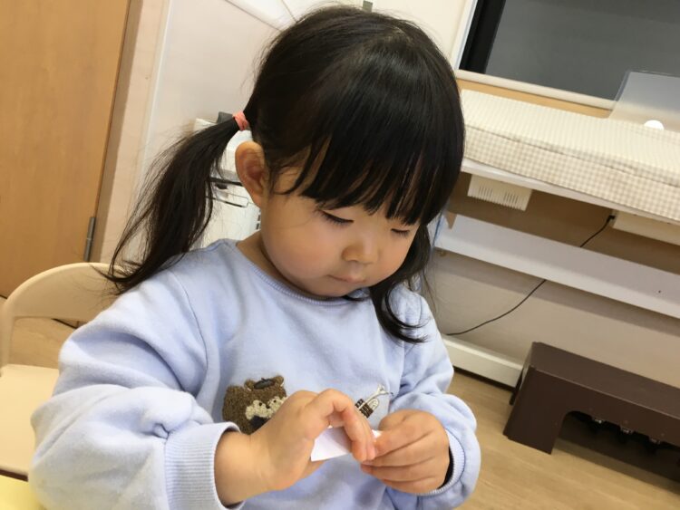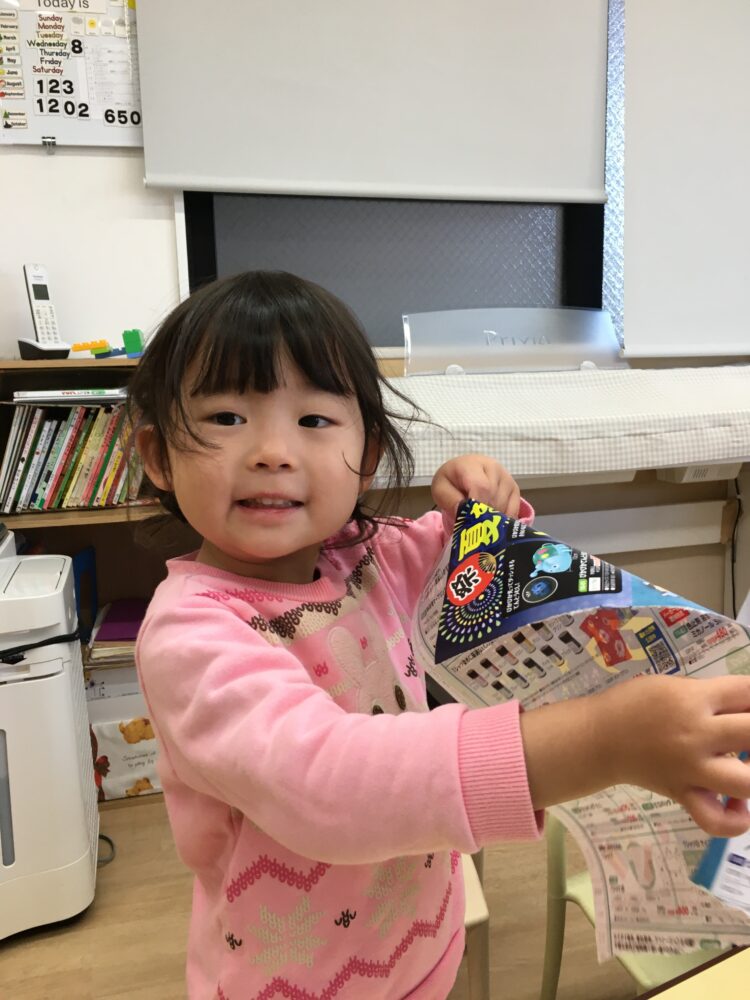 こちらのコーナーでは、折り紙や広告をビリビリと破って遊びました。