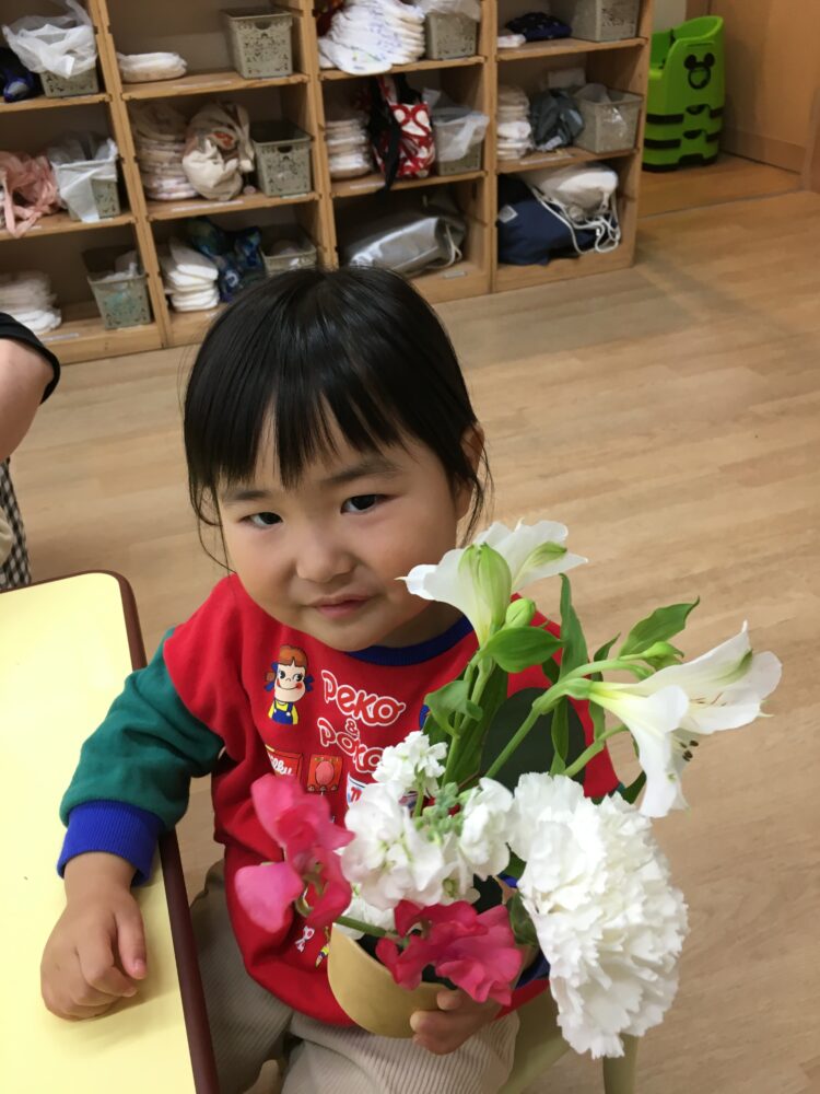 色とりどりのお花を前に、子どもたちは「きれいだね〜」と目を輝かせていました。大きな葉っぱのポポラスを見つけると、「葉っぱ、おおきい!」と驚きの声も聞こえてきました。