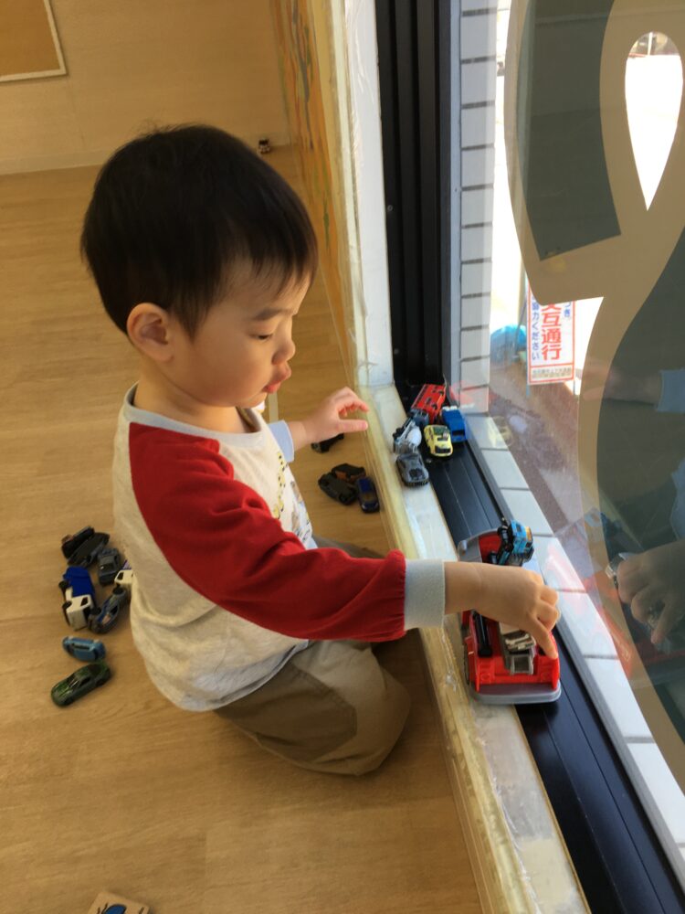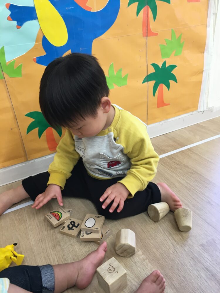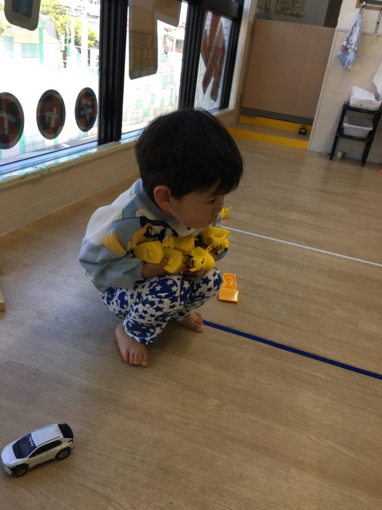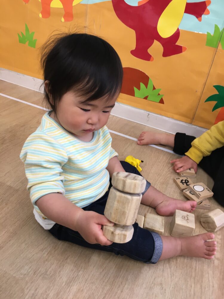 「ぶーん!」と元気な声を出しながら、車を走らせたり、積み木を高く積み上げては崩れる様子を楽しんだりしていました。