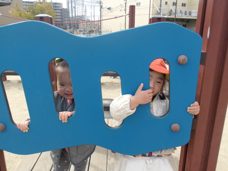 遊具の間から「ばあ!」と、お顔を見せてくれましたよ。
