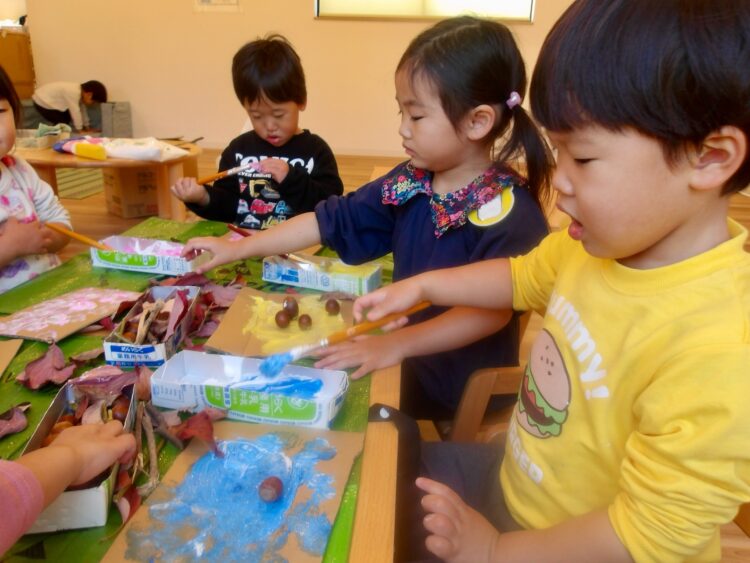 製作では、どんぐりケーキをつくりました。ピクニックで拾ったどんぐりなどの自然物をたくさんのせて楽しみましたよ。