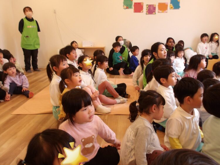 朝の会でひなまつりについて話していたので、「女の子のお祝いする日!」「男の子は5月!」とよく理解していた幼児クラスに、『うれしいひなまつり』の歌を覚えて上手に歌っていた乳児クラスの子どもたちでした♩