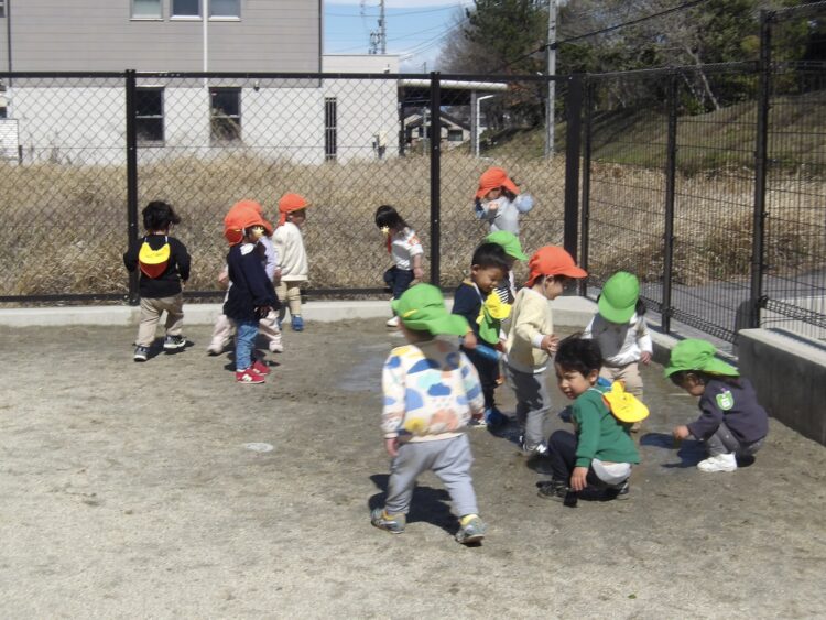 水溜りが気になる子が多く、はじめは指で触ったりしていたのですが、徐々にあそび方が大胆になり、どろんこになりながら、水の音や波紋を楽しんでいました。