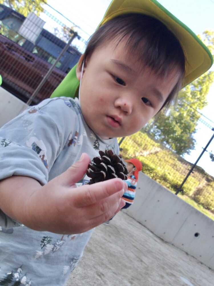 園庭の2本の木は、実はどんぐりの木で、最近はポトポトと大きなどんぐりを落としています。どこから落ちてきたかなー?とどんぐりと見比べて木を見上げる姿がありました。