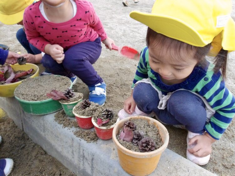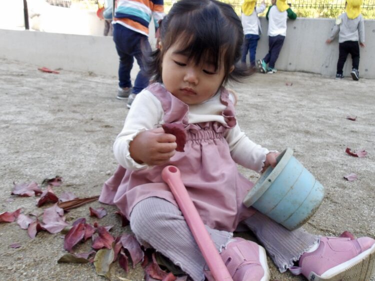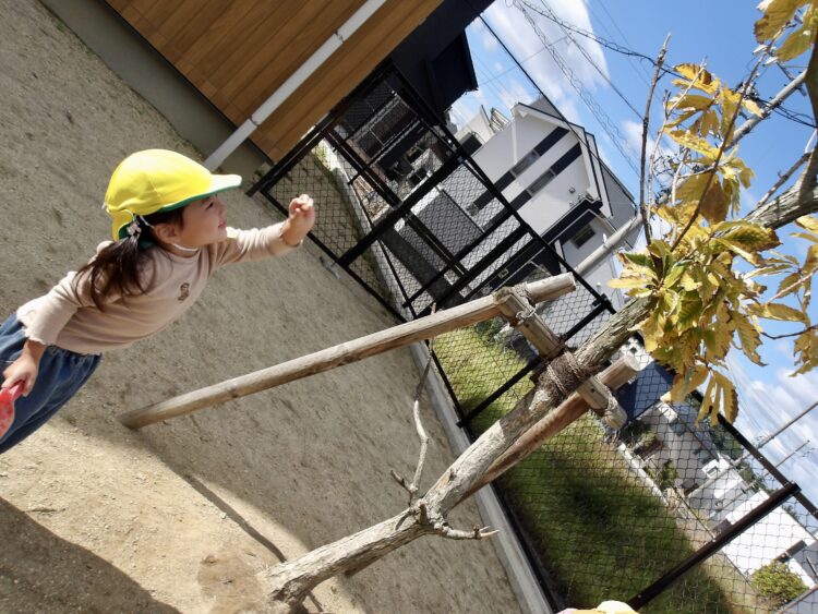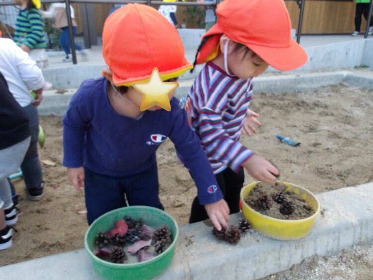 良いお天気の今日は、園庭でたくさん遊びました!園庭には、秋の木の実や葉っぱが登場しましたよ。