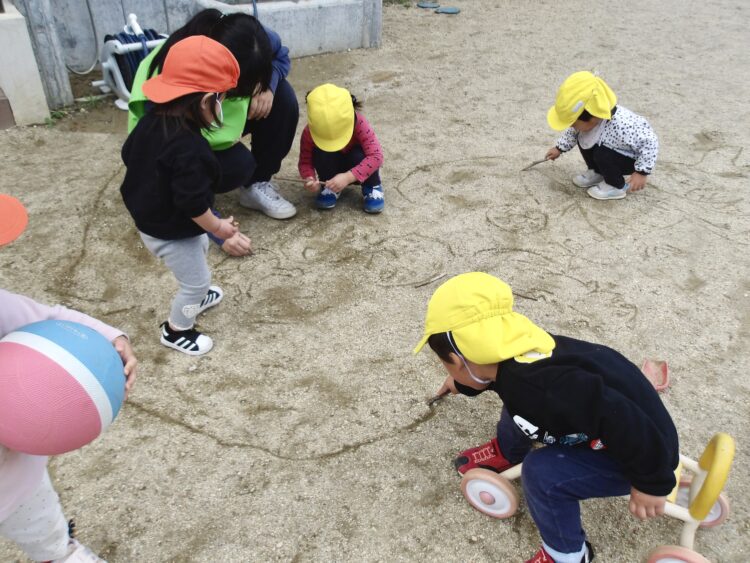 木の枝は、鉛筆に大変身!地面にたくさんのお絵描きをして楽しみました😊