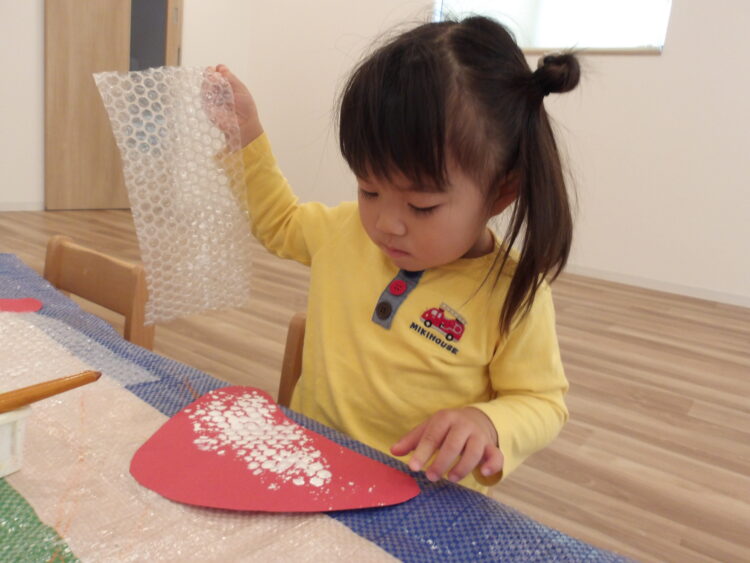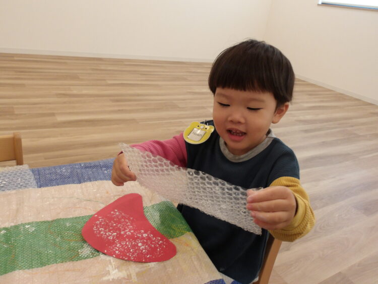 昨日に引き続き、今日はうさぎ組が制作をしましたよ。梱包材のスタンプで遊びました。