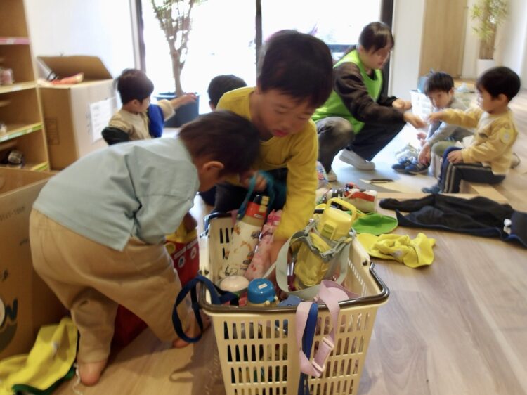 うさぎ組は「自分で!」がどんどんできるようになって来ています!靴、帽子、上着、水筒などたくさんの持ち物がありますが、ひとつずつ自分で片付けています。