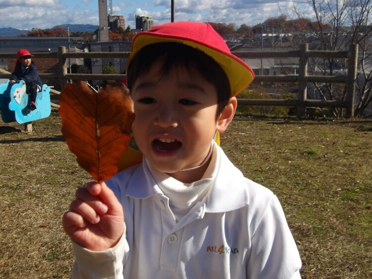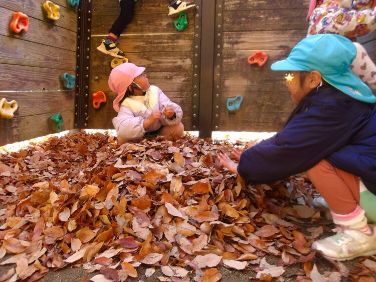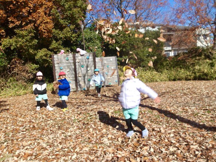 ダイナミックに落ち葉であそんだり、さまざまな色や形の落ち葉を見つけて集めたり、落ち葉あそびを満喫した子どもたちでした🍂