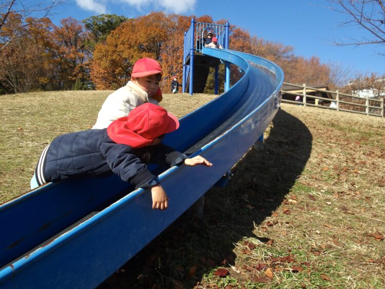 友だちが滑ってくるのを遮断機になりきりながら嬉しそうに待っていました。