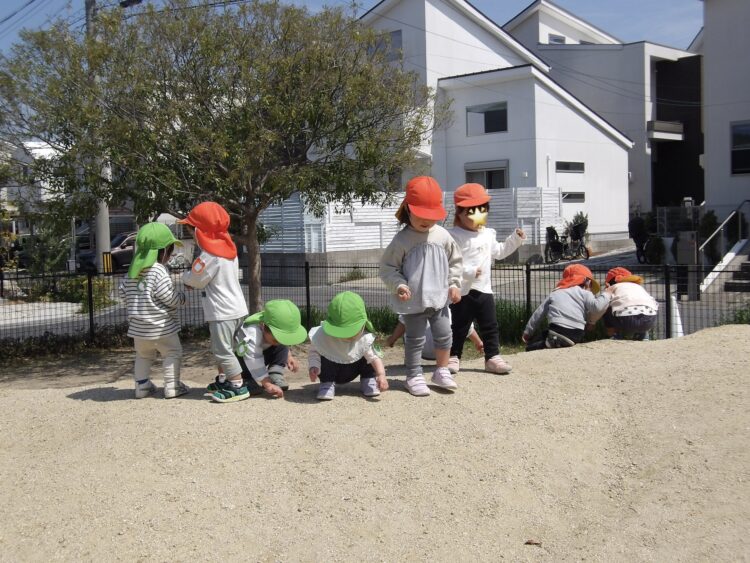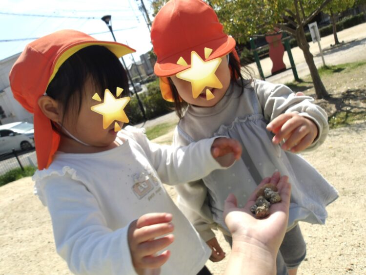 「唐揚げ見つけた〜」と小石を唐揚げに見立てて、見つけるたびに保育者の元へ届けてくれる姿がありました。