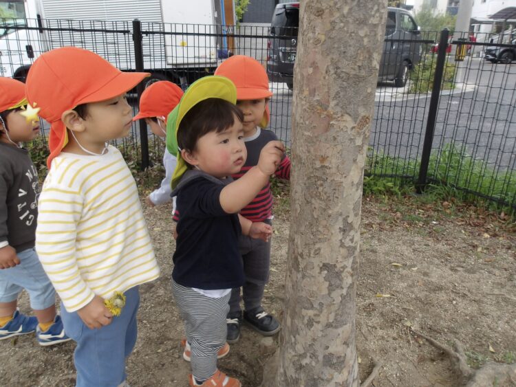 遊具の下よりも木の方がアリがたくさんいることがわかり、顔を近づけて観察していました。
