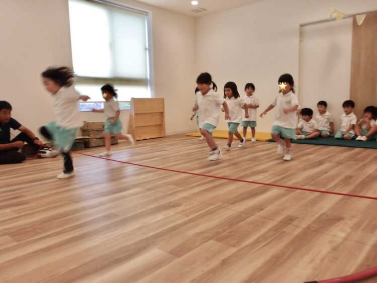 まだ両足跳びになってしまう子もいますが、ほとんどの子が縄の前で立ち止まらずに走るようにジャンプしていました。