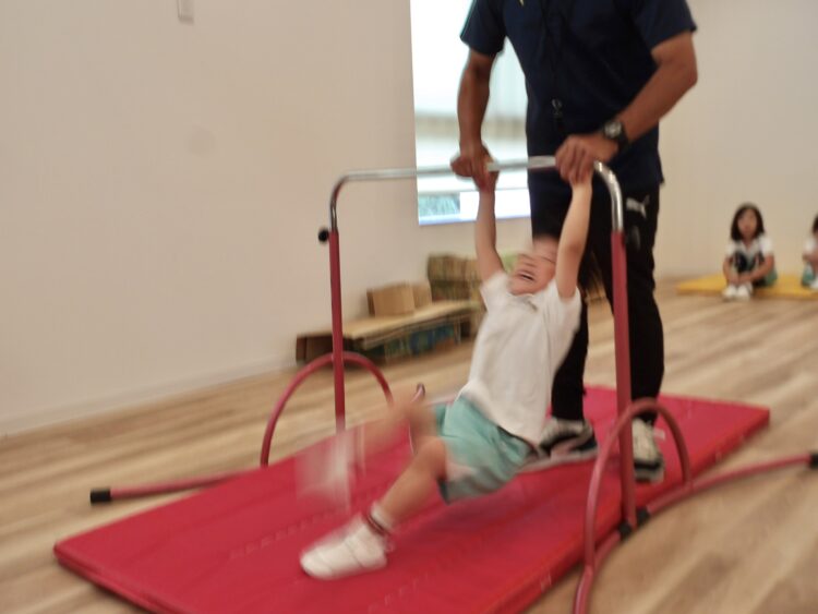 鉄棒ではツバメをしたあと、ジャンプで鉄棒から降りる練習をしました。