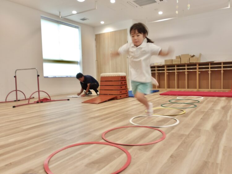 踵をつけずに跳ぶと軽やかに跳べると教えてもらい、意識しながら跳ぶ姿がありました。