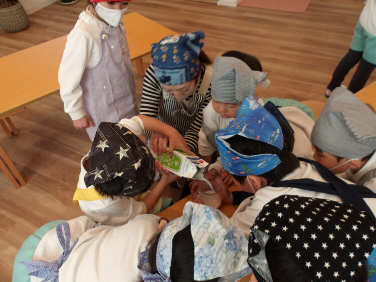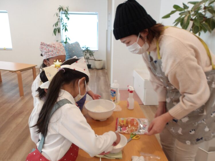 大人に見守られながら自分たちで計量したり、混ぜたりしていきましたよ。