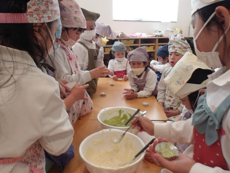 保育参加にきてくれた2名の保護者さまにも参加してもらい、ピンク・白・黄緑チームに分かれて生地作りをしました。