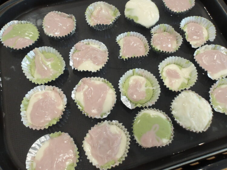 生地ができたら、黄緑→白→ピンクの順でアルミカップにいれていきます。