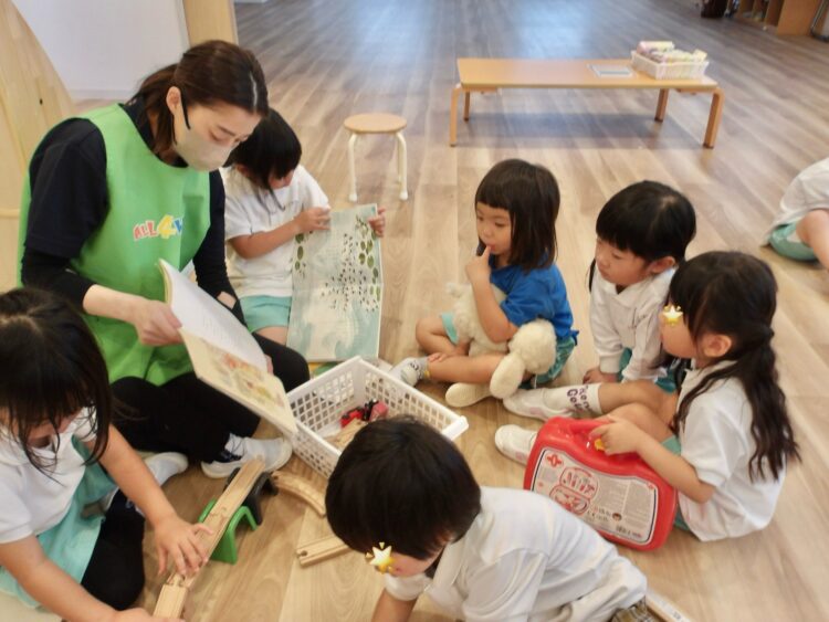 一人の子が「これ読んで〜」と保育者に絵本を手渡し、読み聞かせが始まると、自然とたくさんのお友だちが集まりましたよ☺️