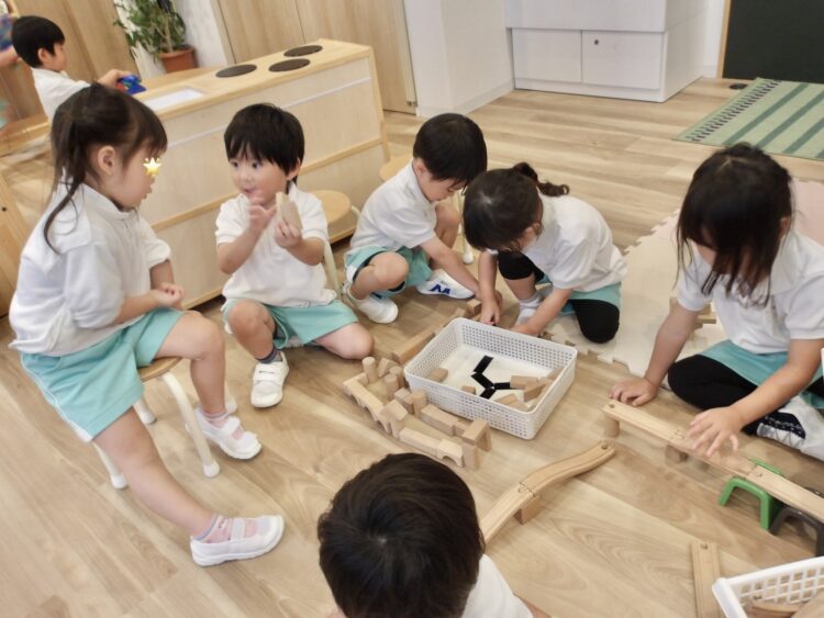 すぐ隣では、積み木を隙間なくきれいに並べて家を作ったり、線路を繋いだりして街を作っていました。
