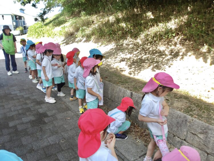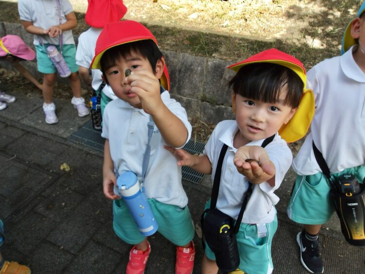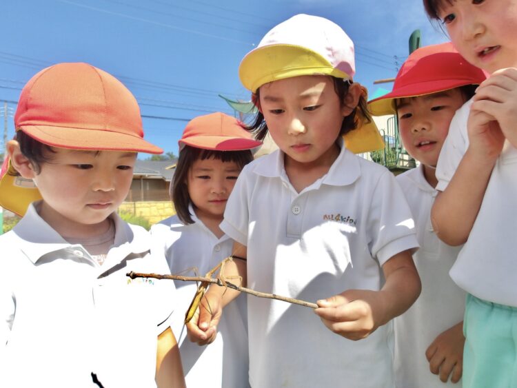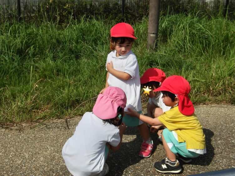 そろそろ保育園に帰ろうかという頃、大きなカマキリを見つけて大興奮!