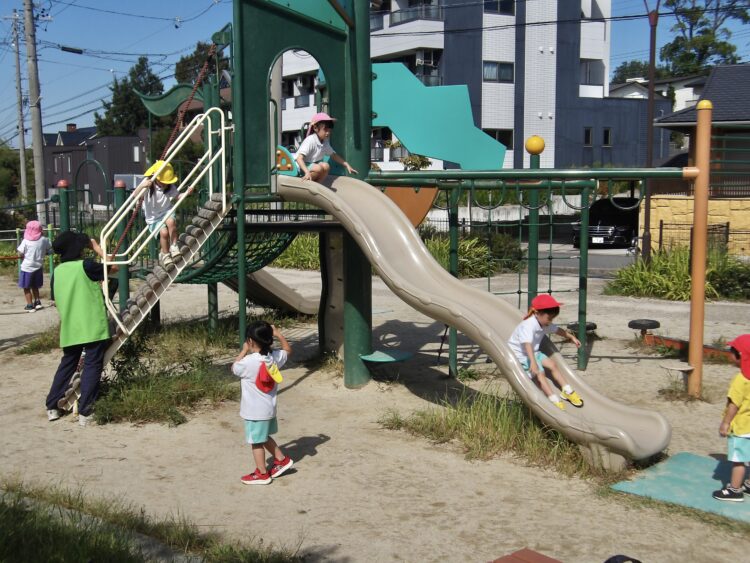 公園に到着すると、早速遊具であそび始めたり、自然散策を楽しんだり、好きな場所へ走っていく子どもたちです。