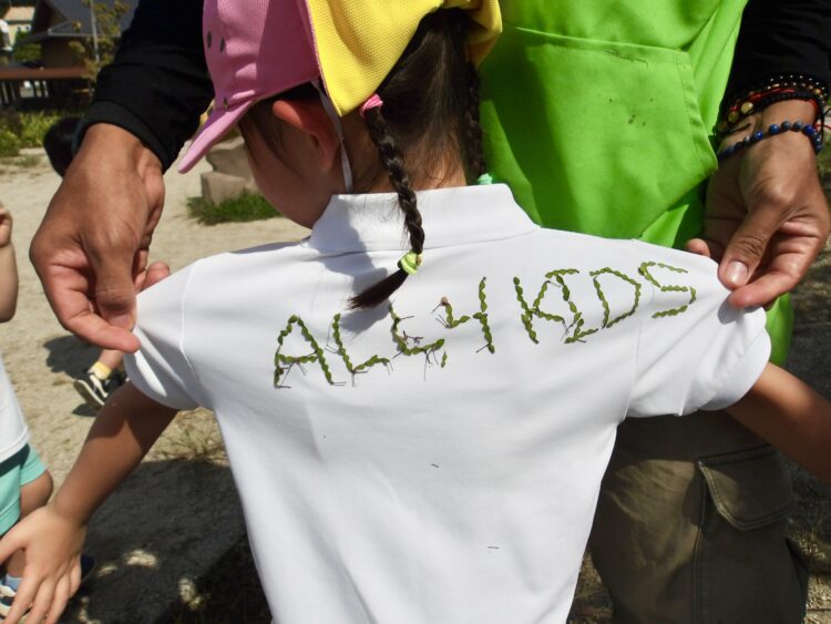 先生と協力して《ALL4KIDS》と文字を入れていました!
