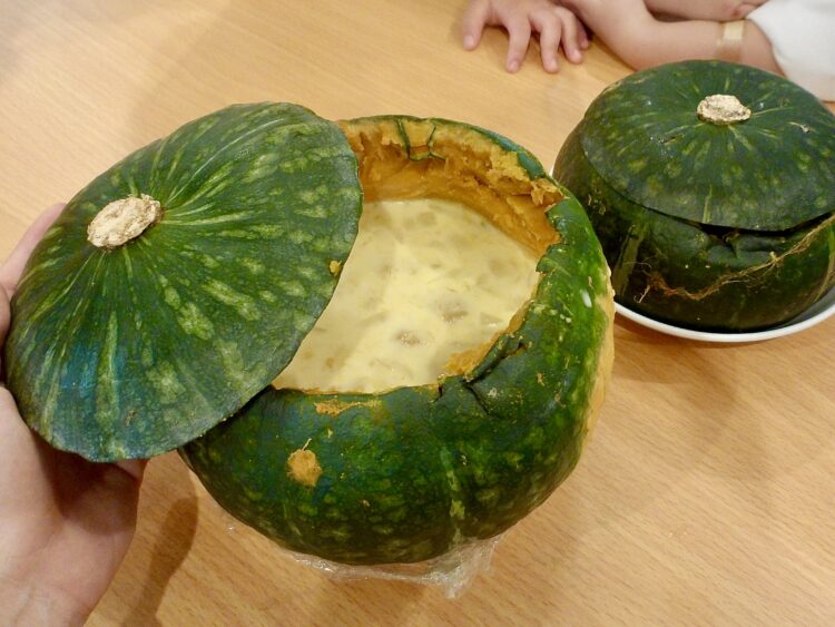 かぼちゃの器に入れたら完成!✨かぼちゃを丸ごと使ったかぼちゃスープの完成でした✨