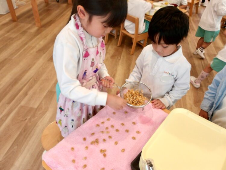 待っている間に、種をきれいに洗って乾かしているお友だちがいました。保育園の畑に植えてみるそうです。大きなかぼちゃができるといいね。