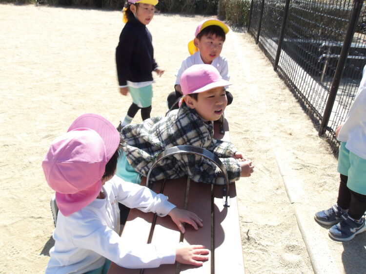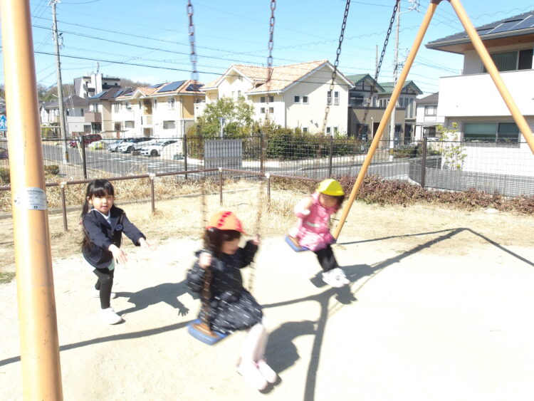 自分でブランコを漕ぐことが難しい子がいると「やってあげる!」と、助けてくれる微笑ましい姿が見られました😊