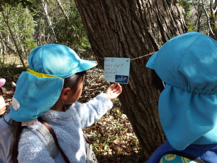 とにじ・たいよう組は『トトロの森とふしぎなおふろや』のセリフを呟き、ハッピースプリングの時の劇を本当の森で再現しながら歩いていましたよ。