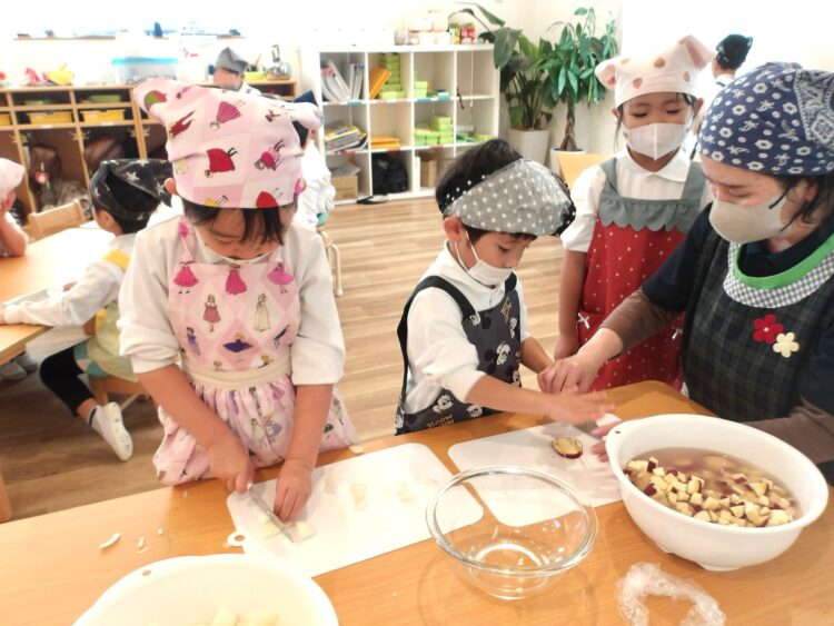 《さつまいも》《しめじ・とうふ》《たまねぎ》チームに分かれて、野菜の下ごしらえをしましたよ。