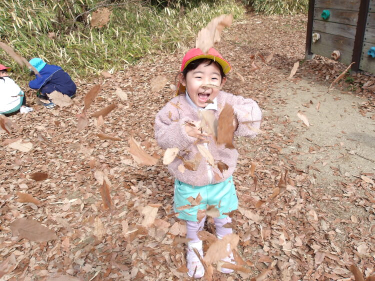かけ合いっこが始まり、子どもたちも保育者も落ち葉まみれになりながら、たくさんあそびました。