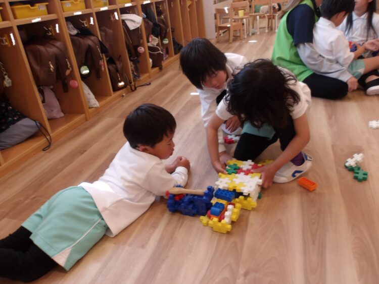井形ブロックで車や銃を作る子、昨日の内科検診を思い出してお医者さんごっこをする子も🩺