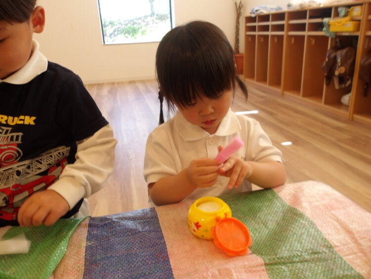 アリさんみたいに少しつけるだけでいいよと伝えていたので、お友だちと「アリさんてこれくらい?」「ありさんくらいだよね」と確認しながら取り組む姿が見られました🤭