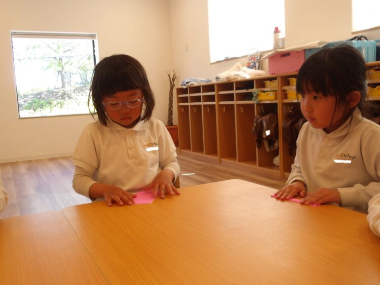 たいよう組は、はじめに真っ直ぐに切るための折り線を自分たちでつけました。