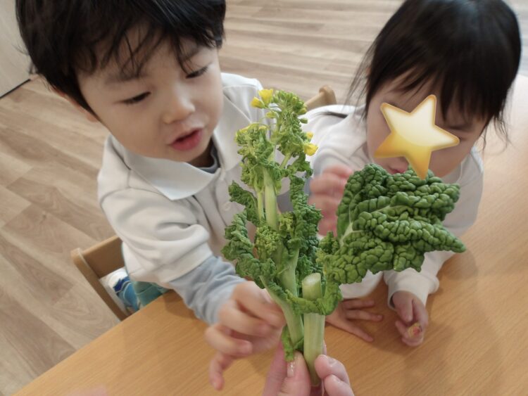 今日は、大きなお花が多かったですよ。菜の花はお部屋にも飾ってあったので、知っているお友だちが多かったです。食べられるお花だと知っている子もいるようで、「食べてみたいなー!」「どんな味かな?」とつぶやく声がありました。
