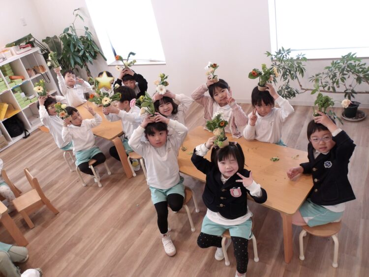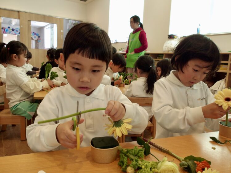 にじ、たいよう組は久しぶりにハサミでお花をカットしてアレンジすることができました。